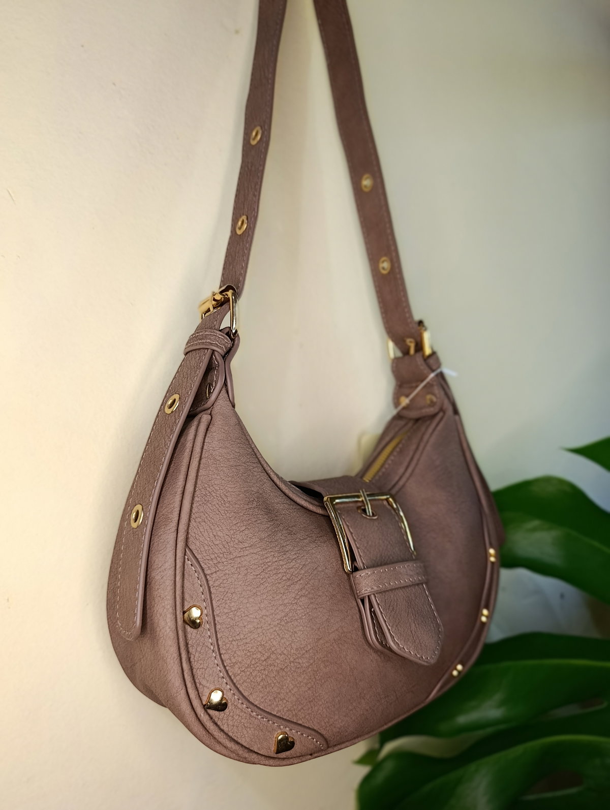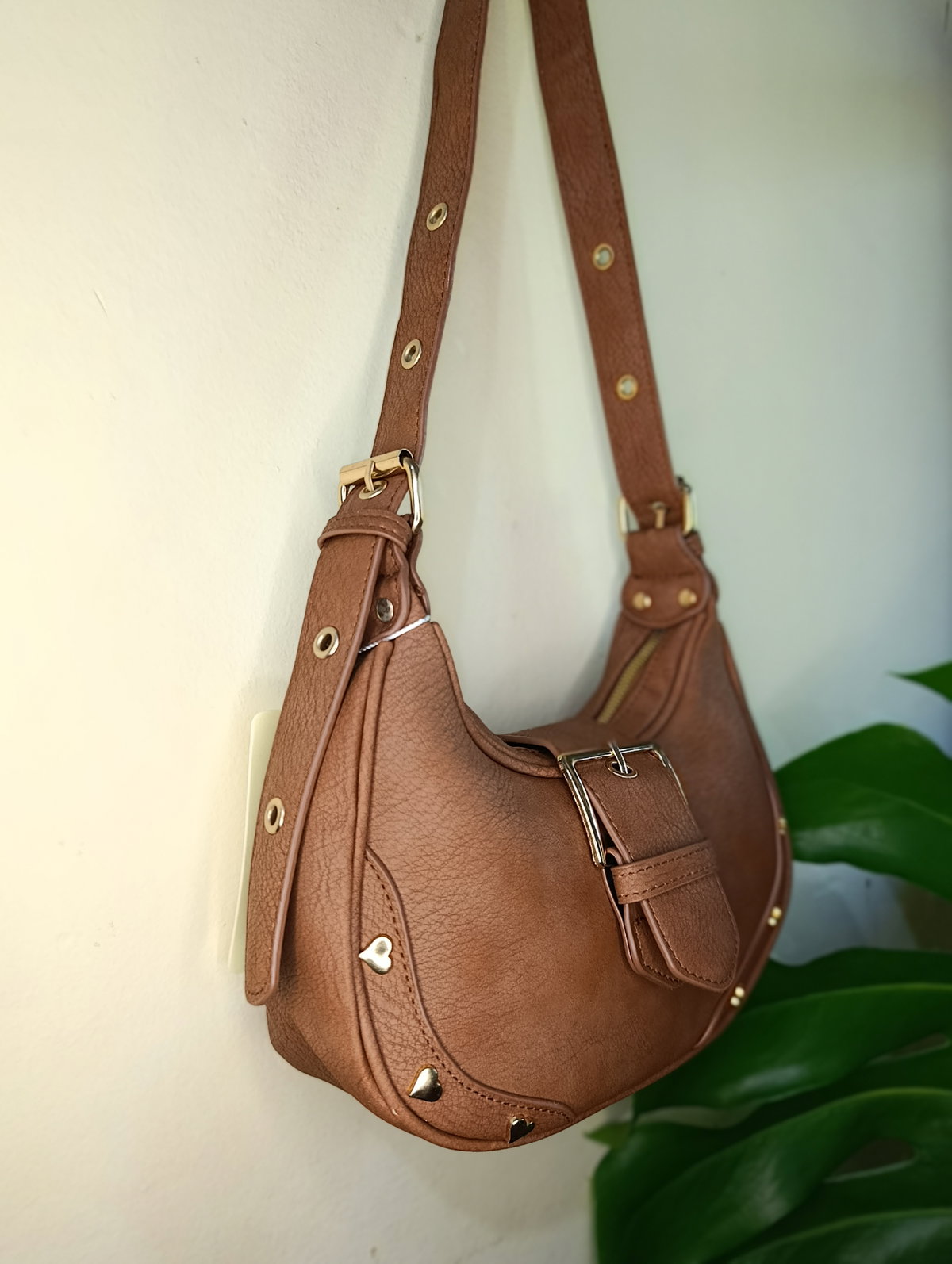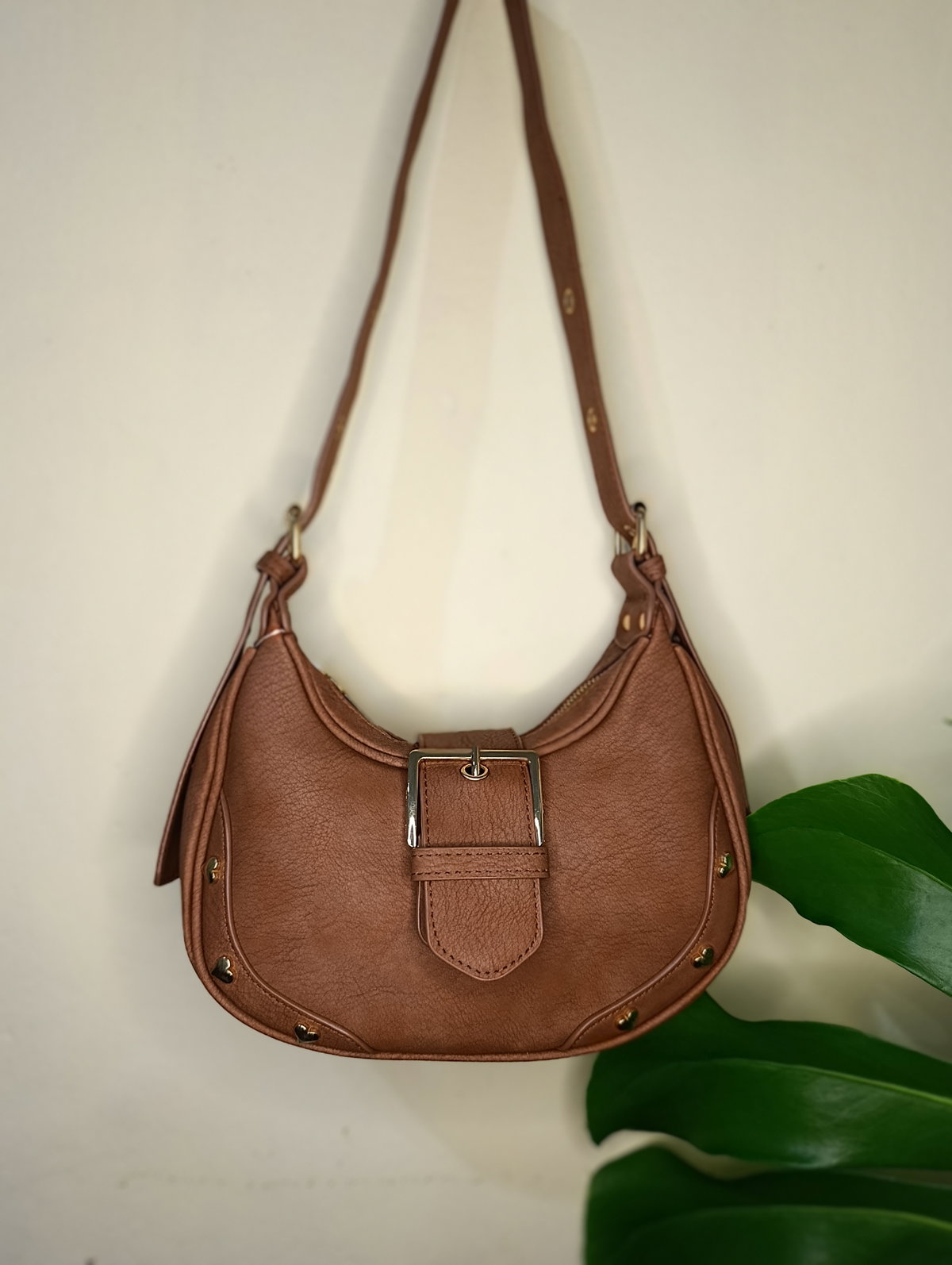 ¡El modelo que vas a querer usar con todo! Esta cartera tipo hobo combina una silueta moderna con detalles delicados que la hacen única. Confeccionada en material sintético con textura visual símil cuero envejecido, destaca por su diseño curvo que es tendencia absoluta esta temporada.