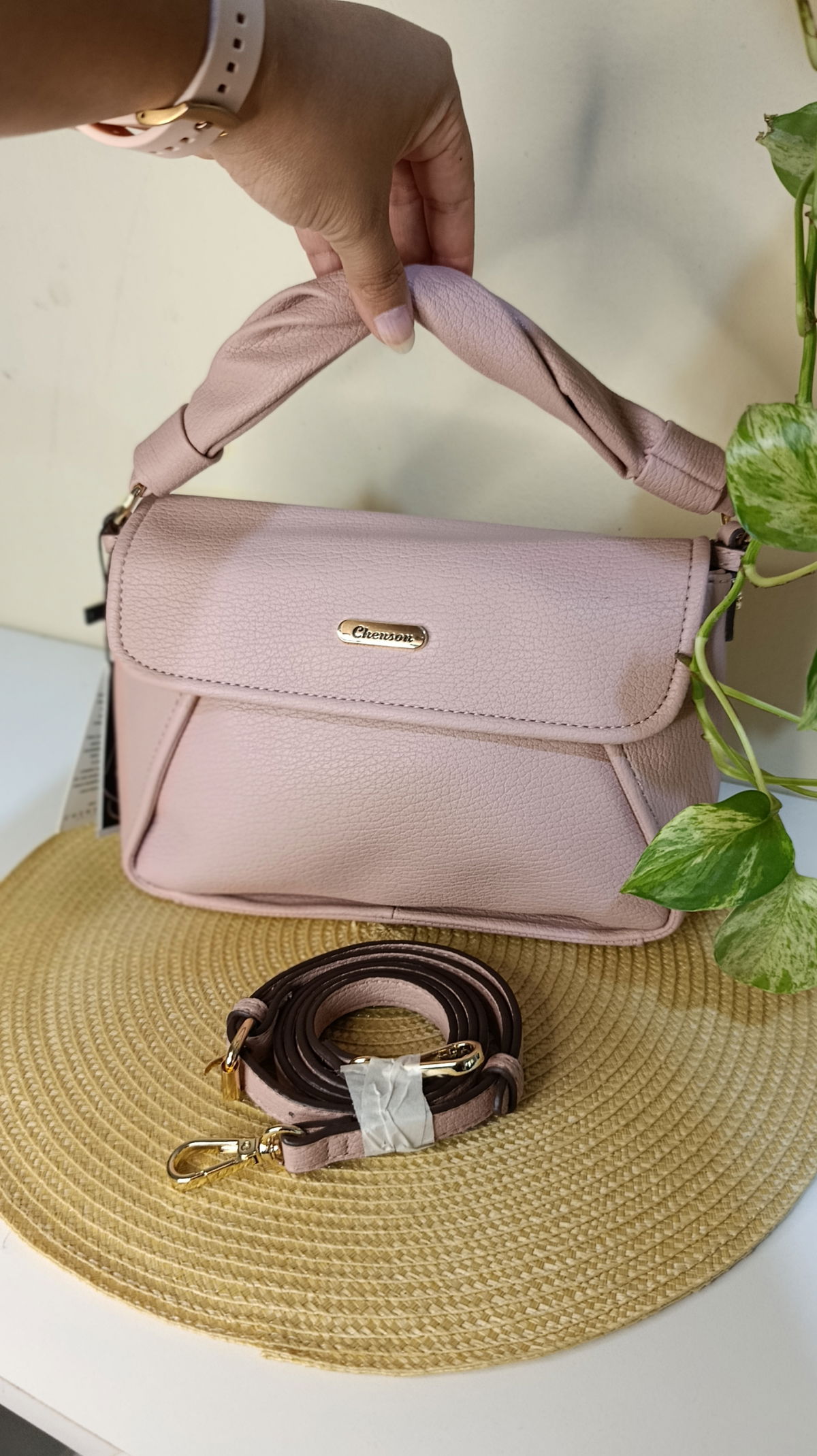 Detalles Premium: Elegante emblema metálico circular de la marca y herrajes dorados.