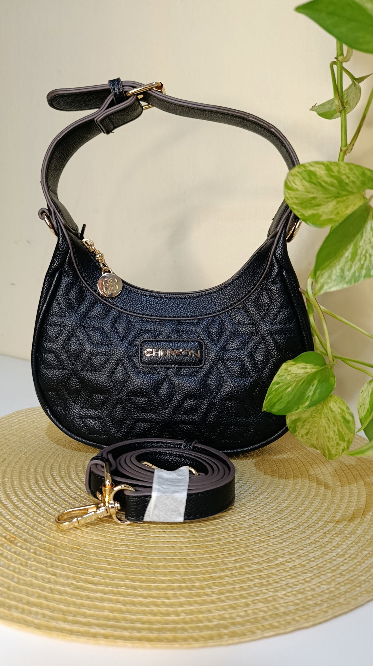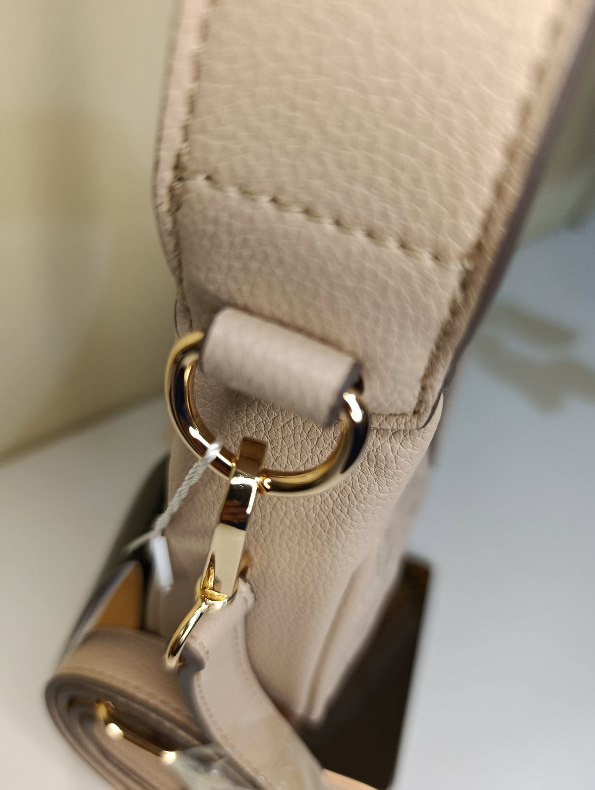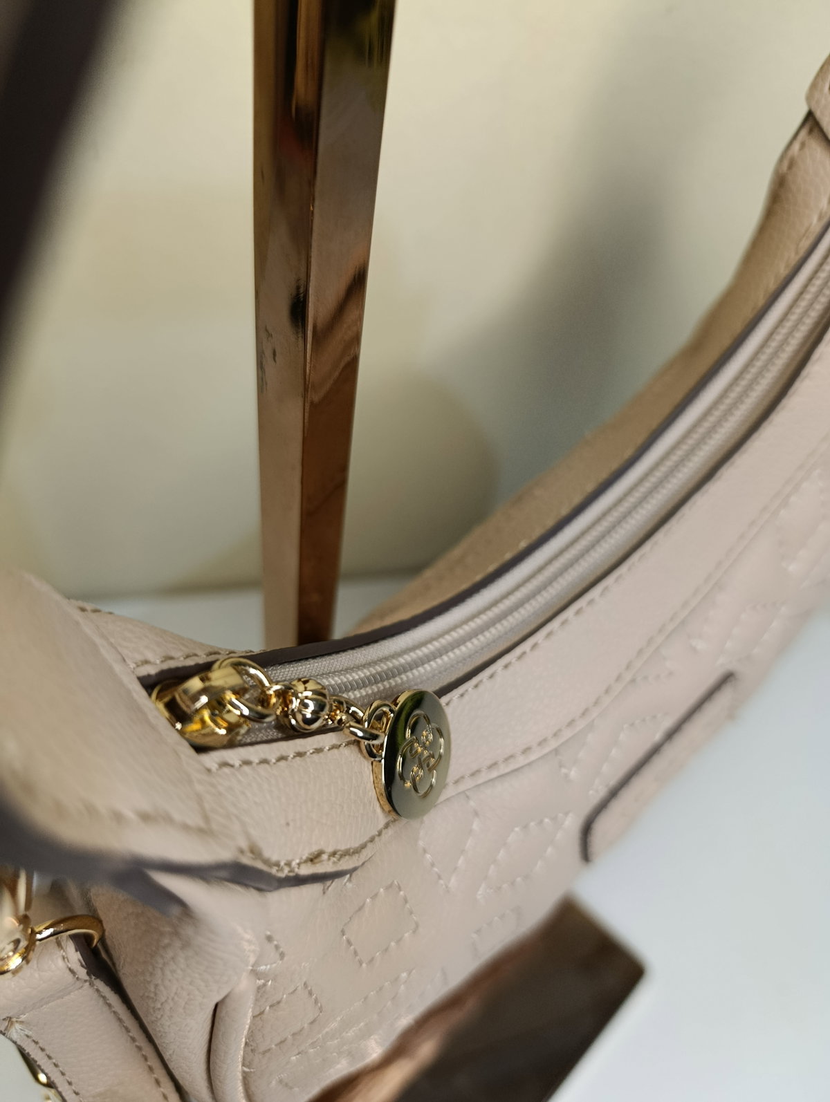 Detalles Premium: Herrajes dorados brillantes y placa frontal con el logo de la marca.