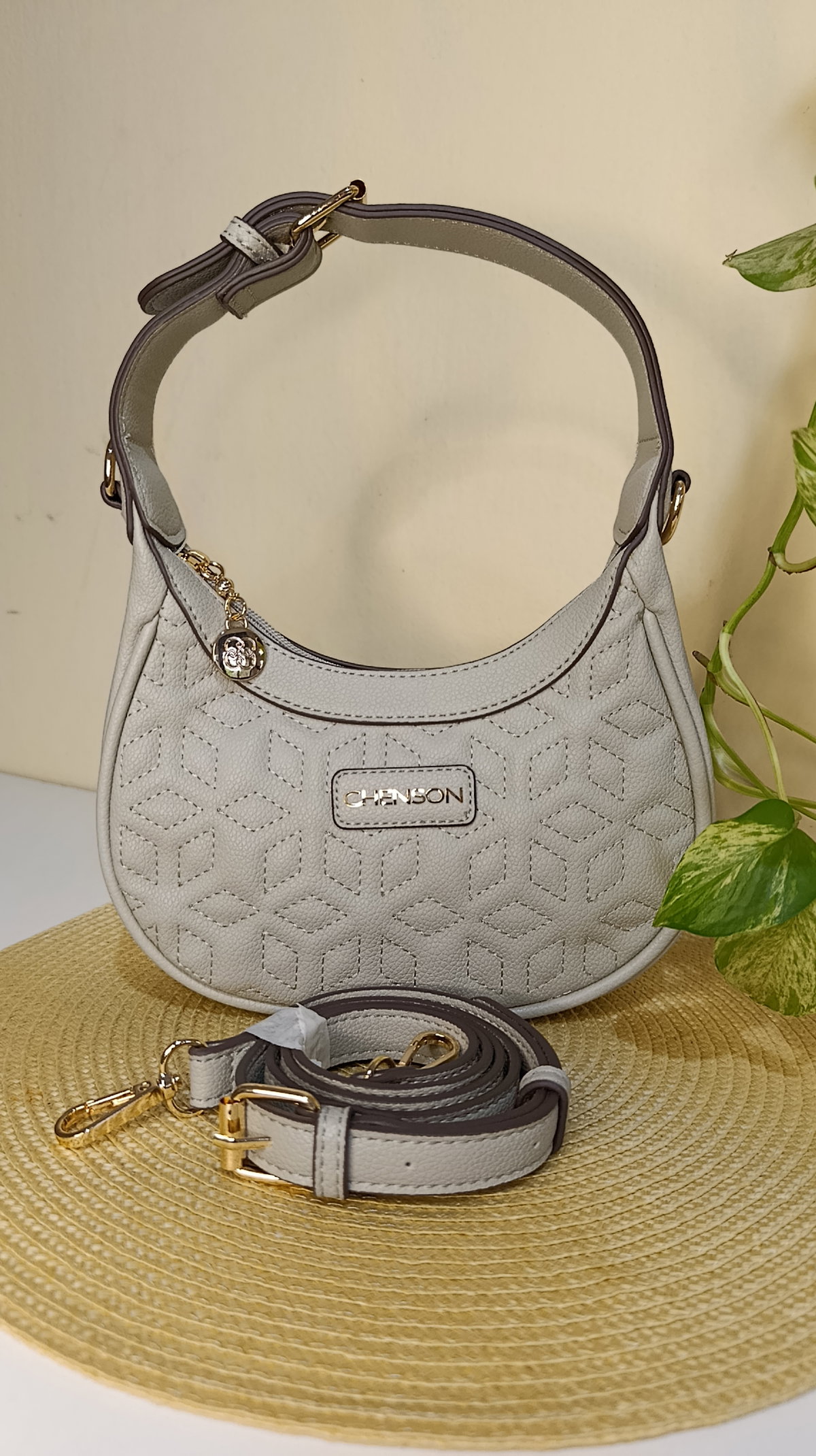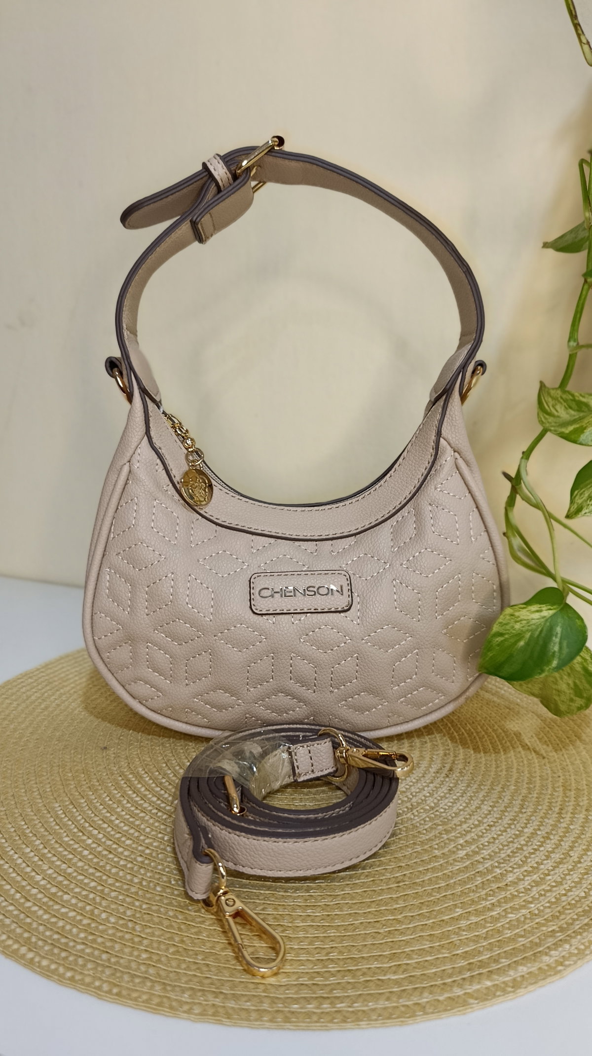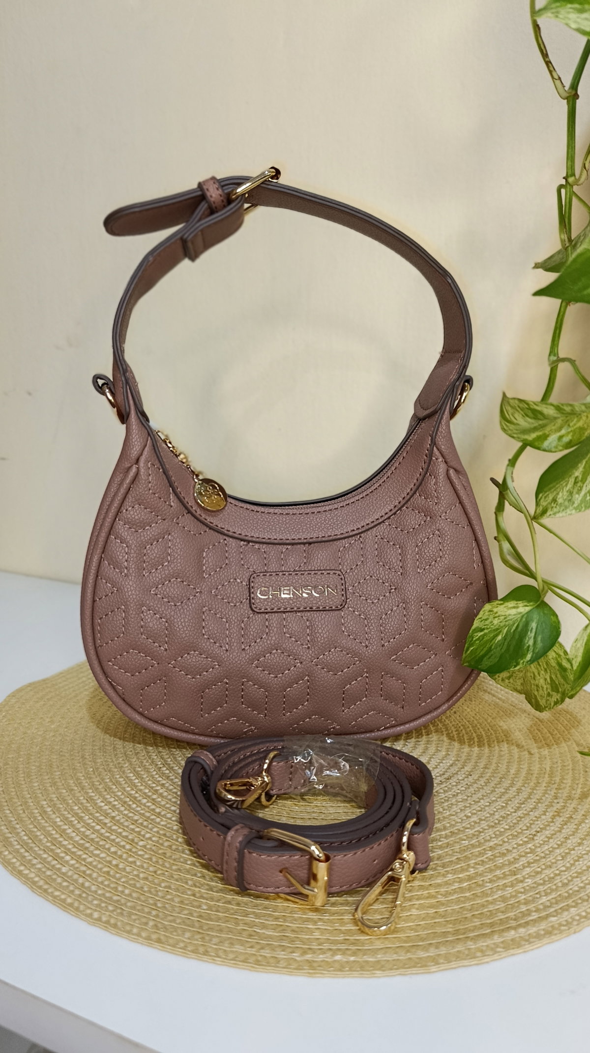 Detalles Premium: Herrajes dorados brillantes y placa frontal con el logo de la marca.