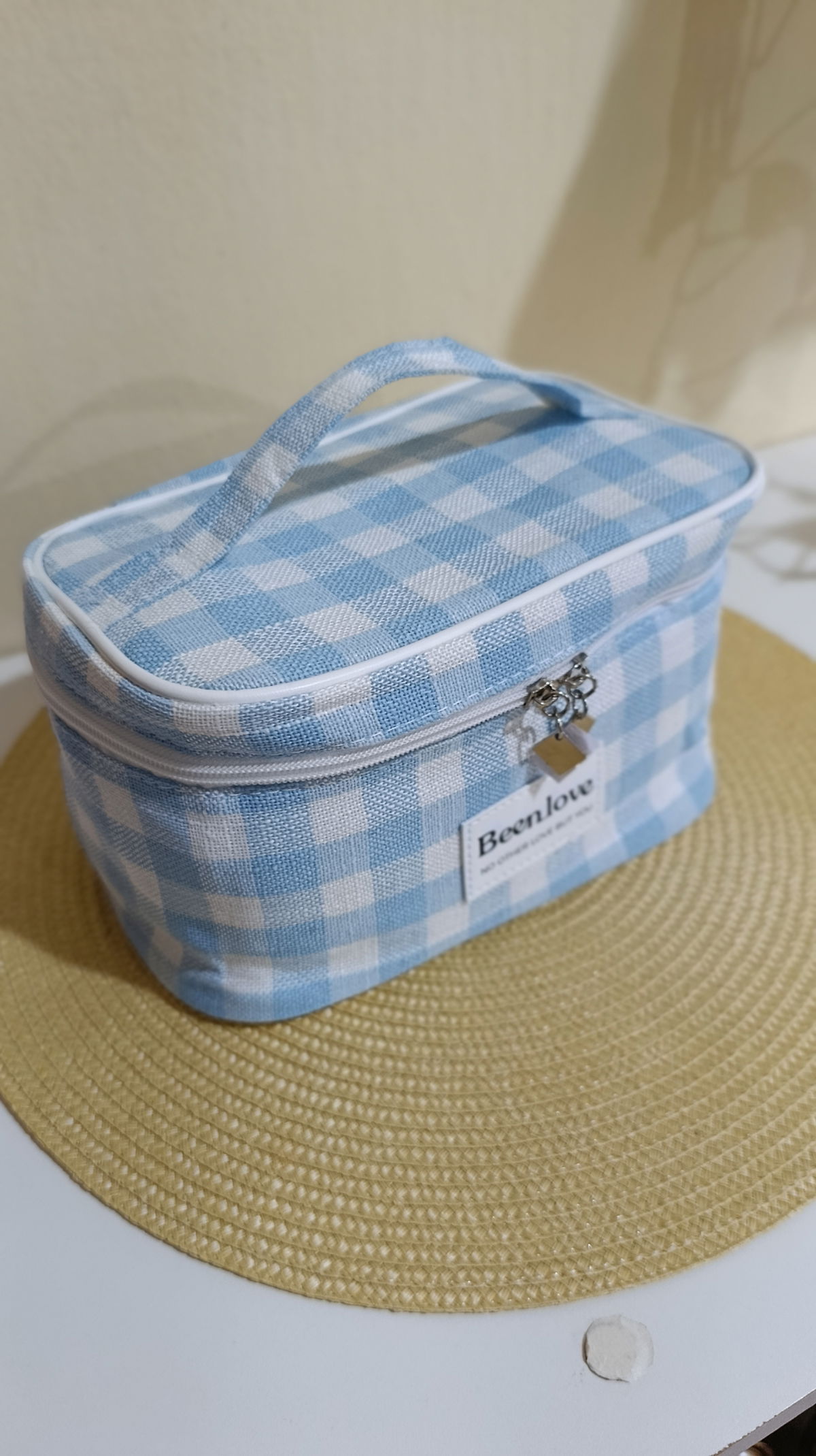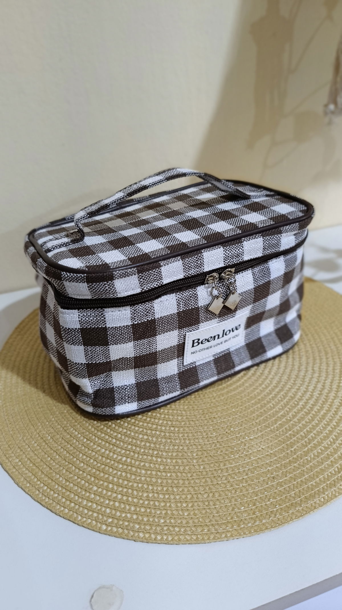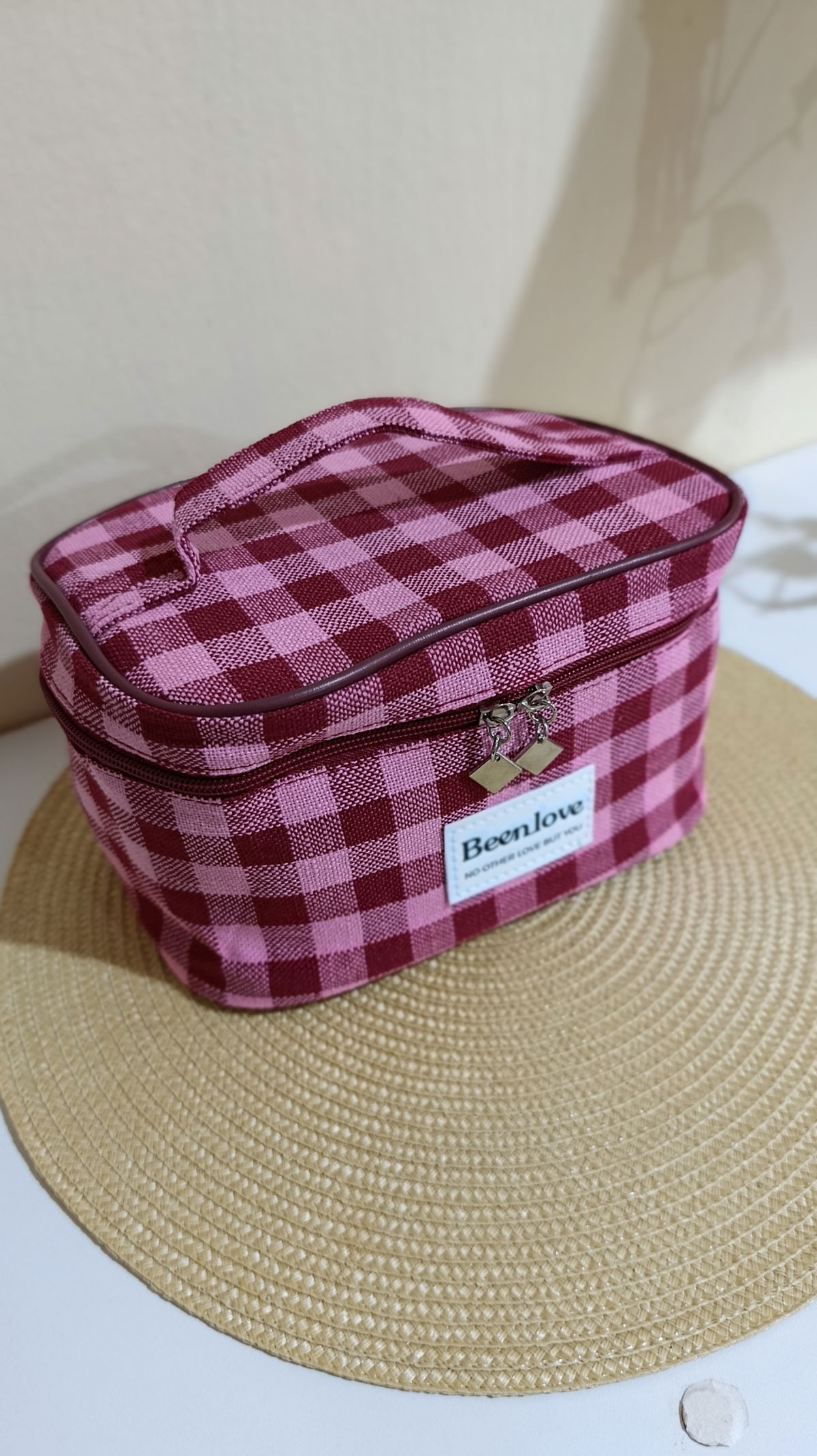 Diseño clásico a cuadros (gingham) con doble cierre, ideal para organizar tus esenciales de belleza.
