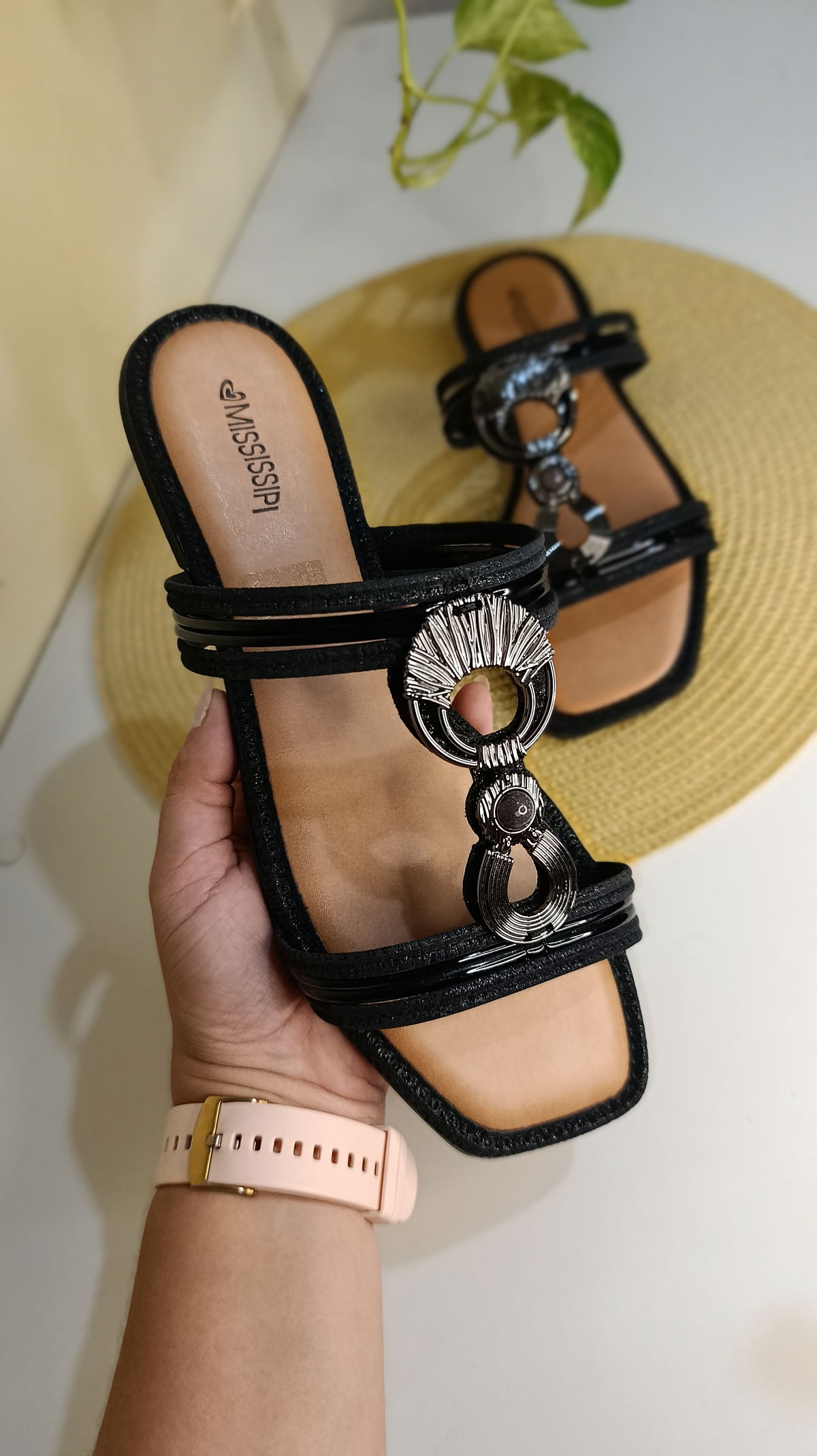 lumina tus pasos con un estilo único. Esta sandalia de Mississipi redefine el concepto de calzado plano mediante un diseño de tiras múltiples que convergen en un espectacular herraje central dorado con texturas que evocan formas orgánicas y marinas. Es el equilibrio perfecto para quienes desean la comodidad de una sandalia rasteira con la presencia de un accesorio de alta gama.