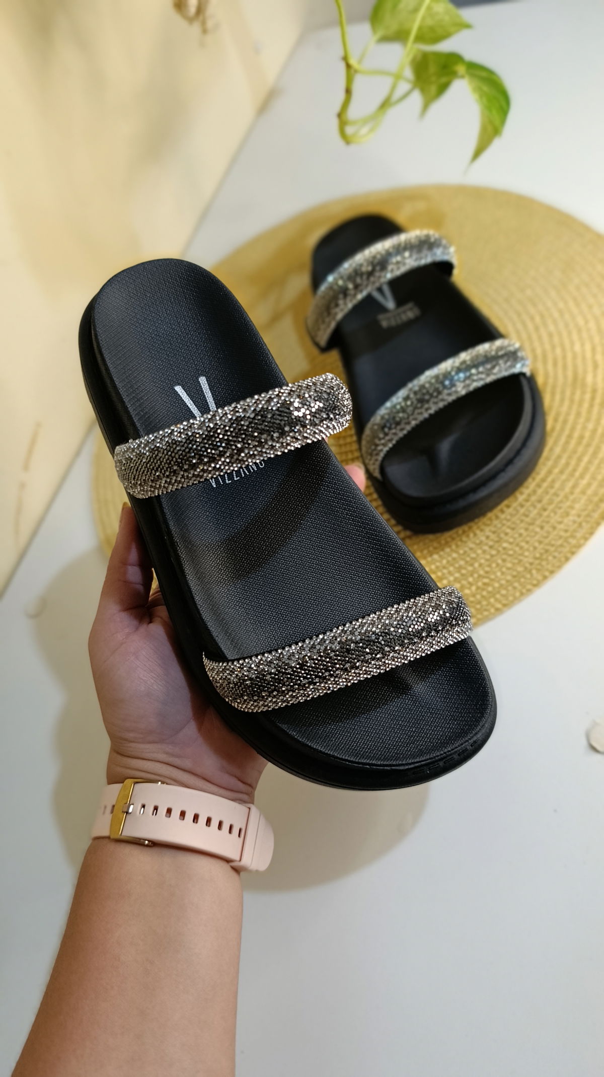 Elegancia pura en cada paso. Este modelo destaca por sus tiras de brillo uniforme que capturan la luz de manera espectacular. Con una estética más minimalista que la versión estampada, es el complemento ideal para vestidos de verano o looks monocromáticos que necesitan un toque de luz.