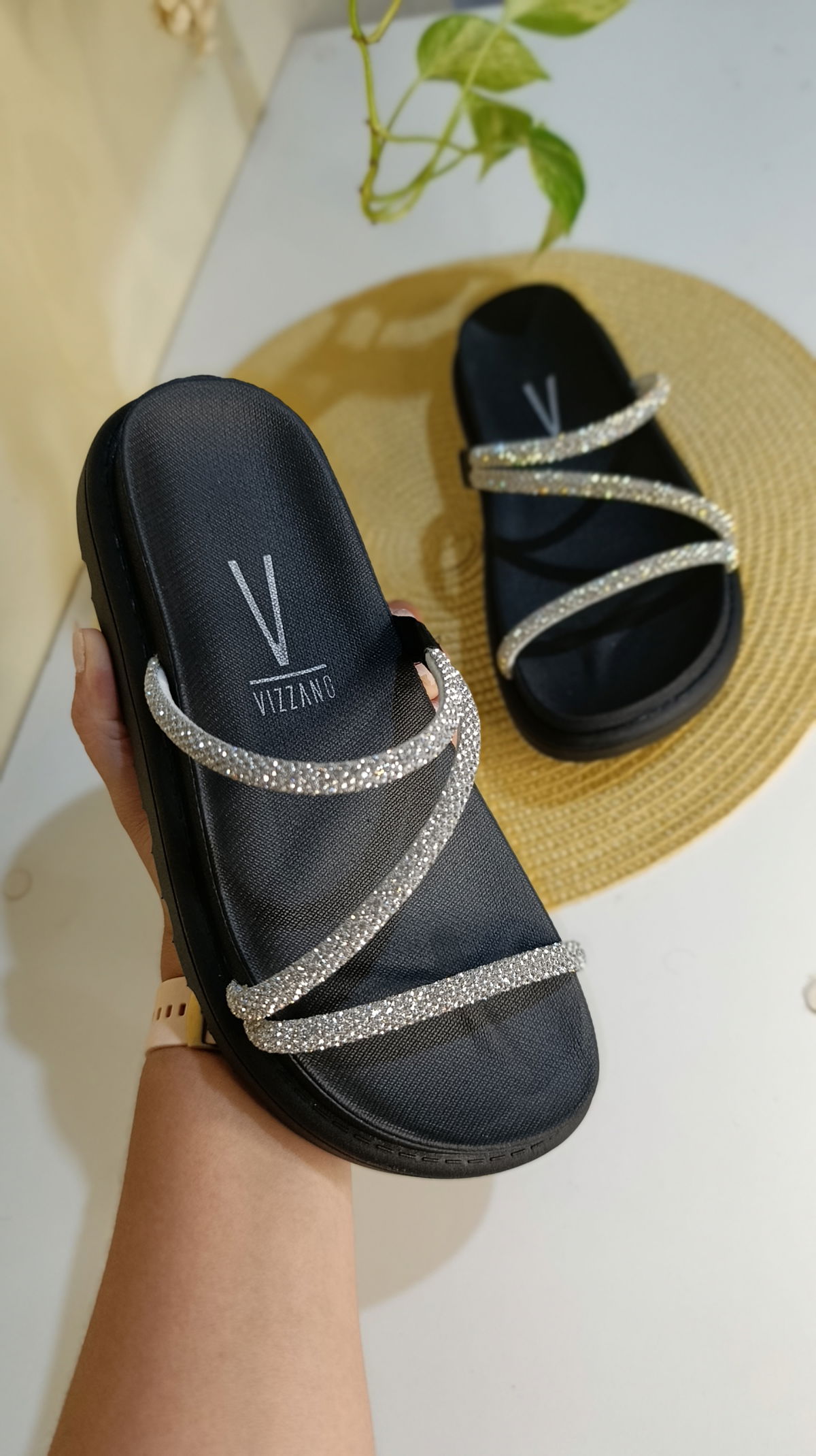 Sofisticación con un giro moderno. Este modelo de Vizzano presenta un diseño de tiras delgadas que se cruzan elegantemente sobre el pie, brindando un ajuste delicado pero firme. El brillo continuo de sus cristales transforma una sandalia relajada en el accesorio perfecto para destacar en cualquier ocasión.