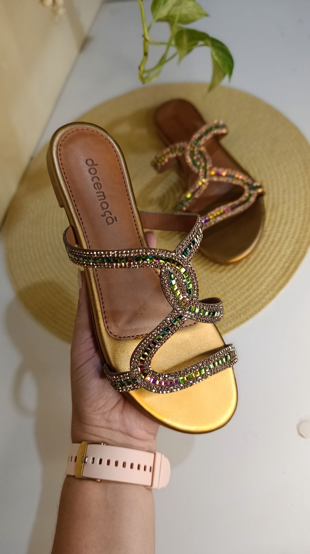 Eleva tu estilo con la calidez del dorado. Esta sandalia plana de Doce Maçã combina una base metalizada con un intrincado diseño de tiras entrelazadas, decoradas con cristales que reflejan destellos en tonos verdes, púrpuras y ámbar. Es el calzado perfecto para quienes buscan elegancia sin renunciar a la frescura y comodidad de una suela plana.